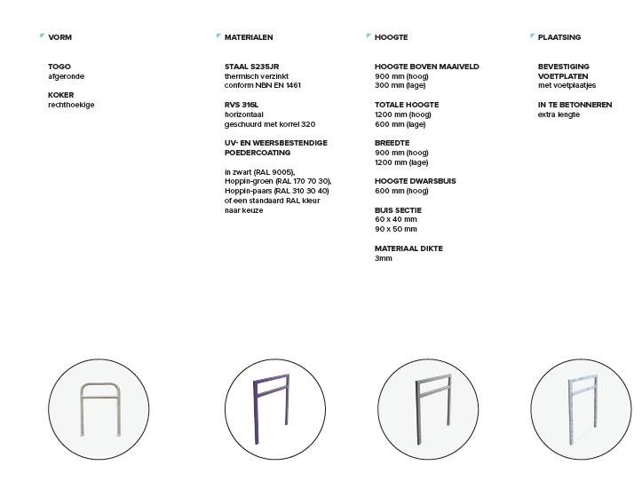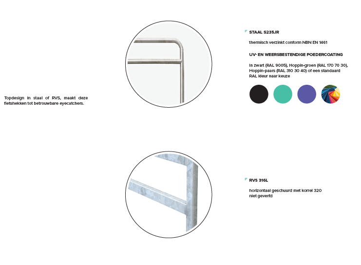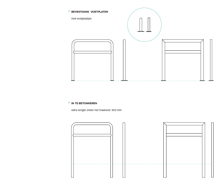 Voor het fietsnietje kies je de vorm, het materiaal, de kleur en de manier van plaatsing (zie hieronder)