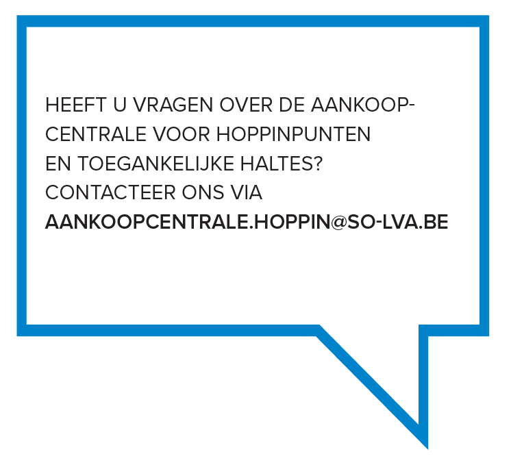 Heb je vragen voor de aankoopcentrale voor Hoppinpunten en toegankelijke bushaltes, dan kan je steeds contact nemen met aankoopcentrale.hoppin@so-lva.be. Steden en gemeenten kunnen ook steeds terecht bij hun eigen streekintercommunale.