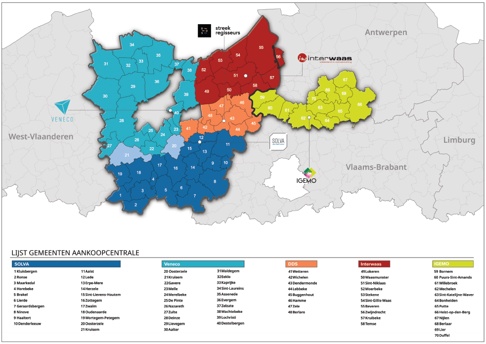 De aankoopcentrale is er voor alle aangesloten gemeenten bij intercommunales SOLVA, DDS, Interwaas, Veneco en Igemo